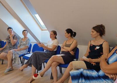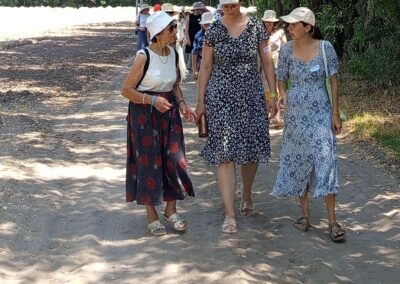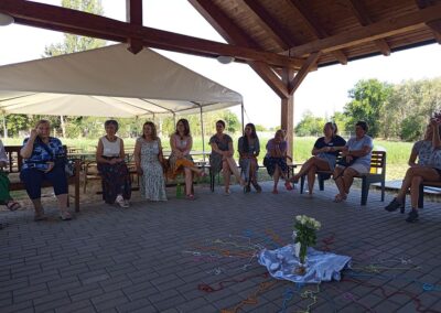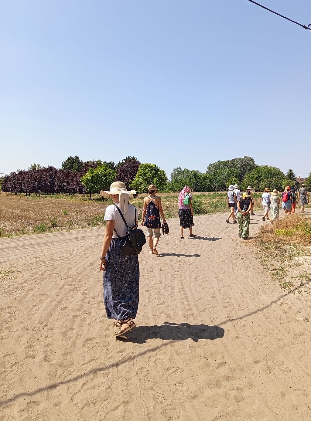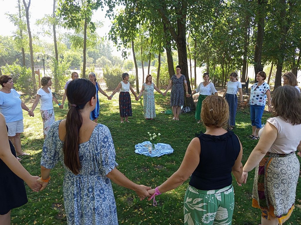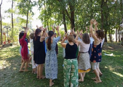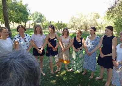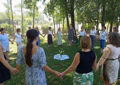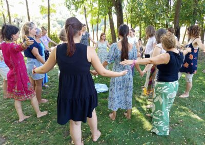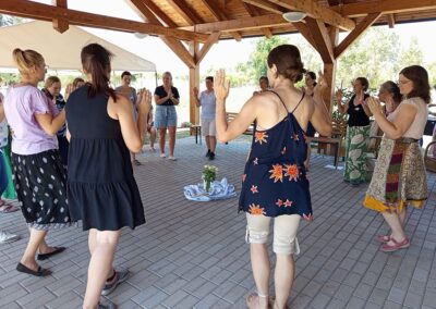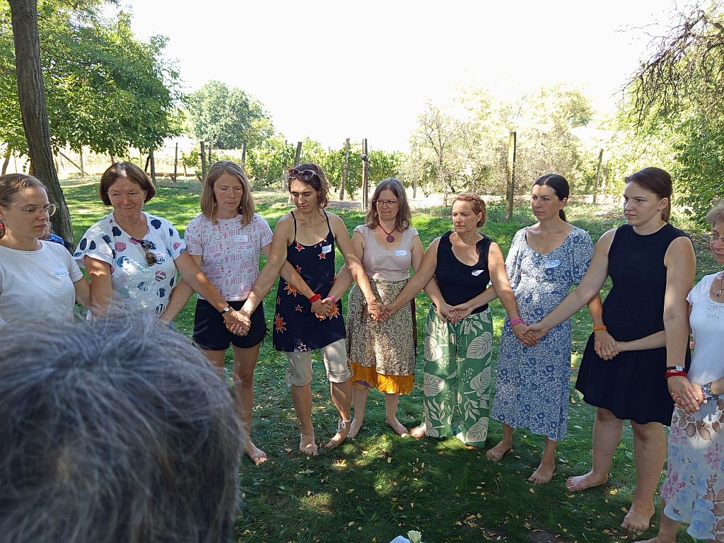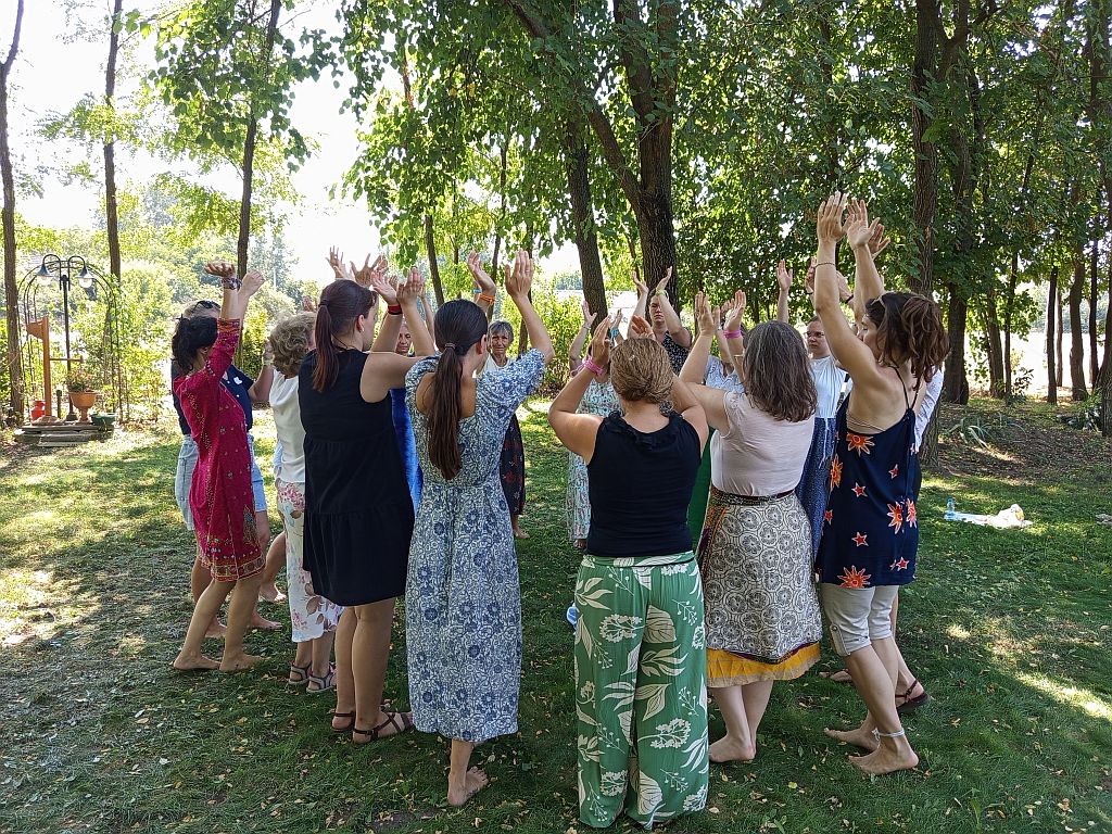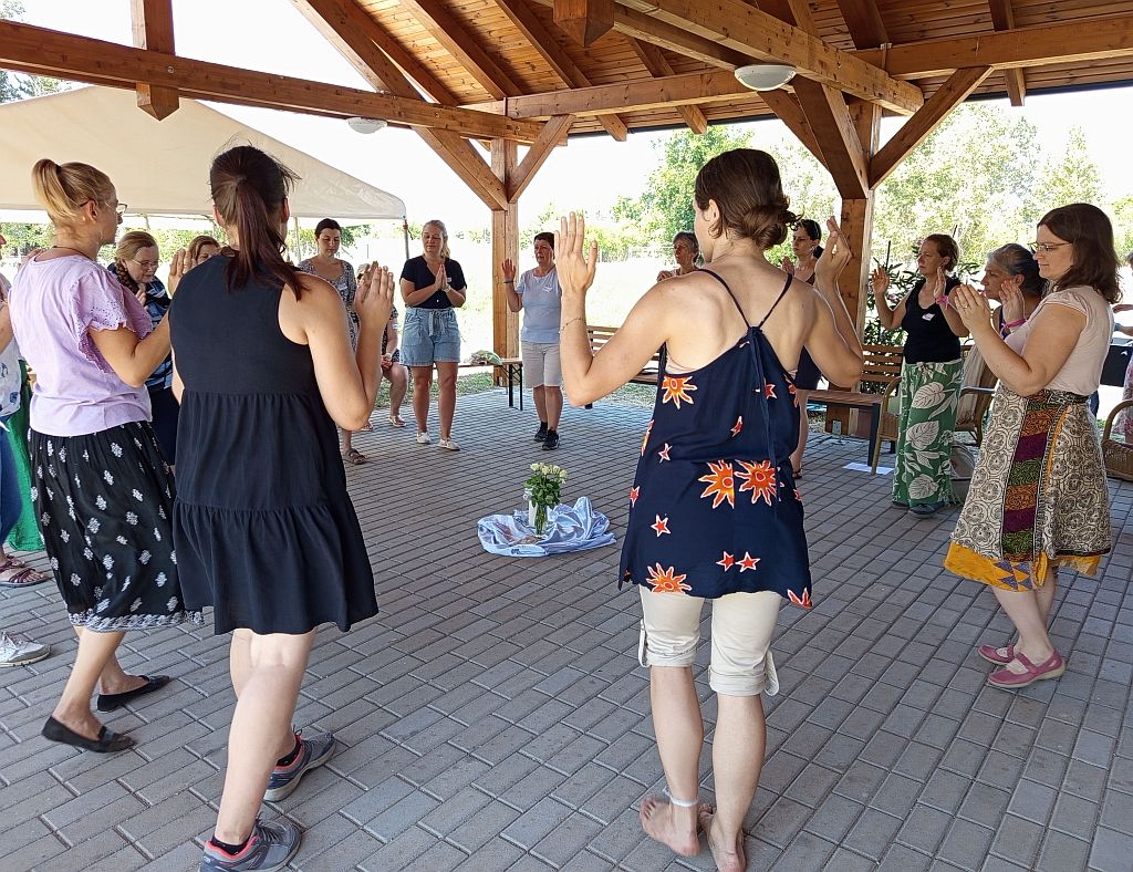 A későbbiekben liturgikus körtáncokat tanultunk: számomra ez volt az első ilyen alkalom. Csak egy kis betekintés, milyen is volt az élmény: kint az árnyékban, mezítláb a füvön, érezni a kellemes szellőt a nagy melegben és közben együtt táncolni egy azonos lelkületű női körrel. Igazán lélekfeltöltő tevékenységnek tűnik, ugye? Az is volt! Akkor, ott, számomra tényleg a béke és hála szigete volt.